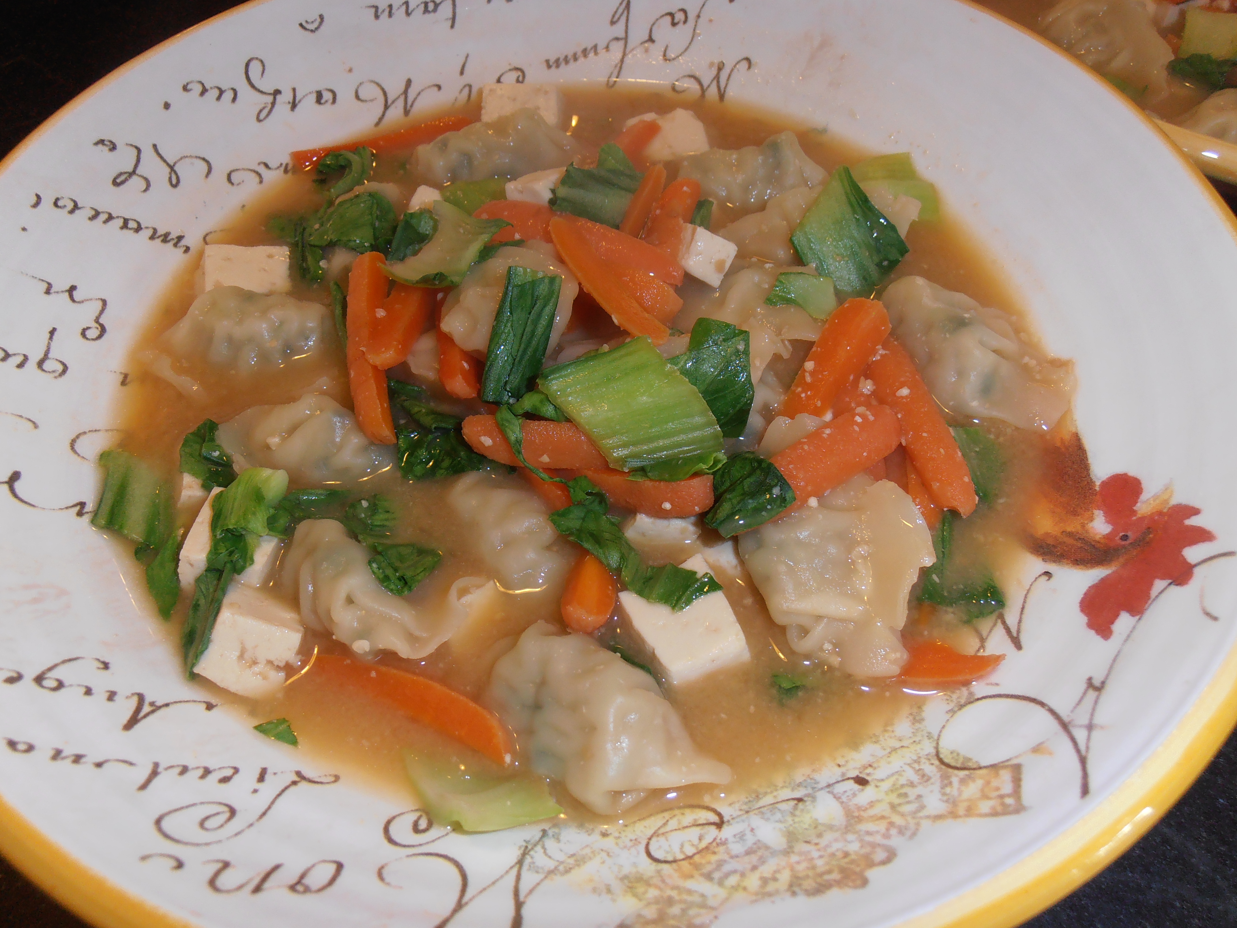 Bring water or broth to boil. Mix miso in 1/2 cup broth or water, add to simmering water or broth. Add more if stronger broth desired. Simmer slivered carrots until still somewhat crunchy. Add cubed tofu and dumplings, simmer to heat through, about 2-3 minutes. Add bok choy stems, simmer 1 minute. Add bok choy greens and stir soup to wilt the greens. Serve garnished with chopped scallions.