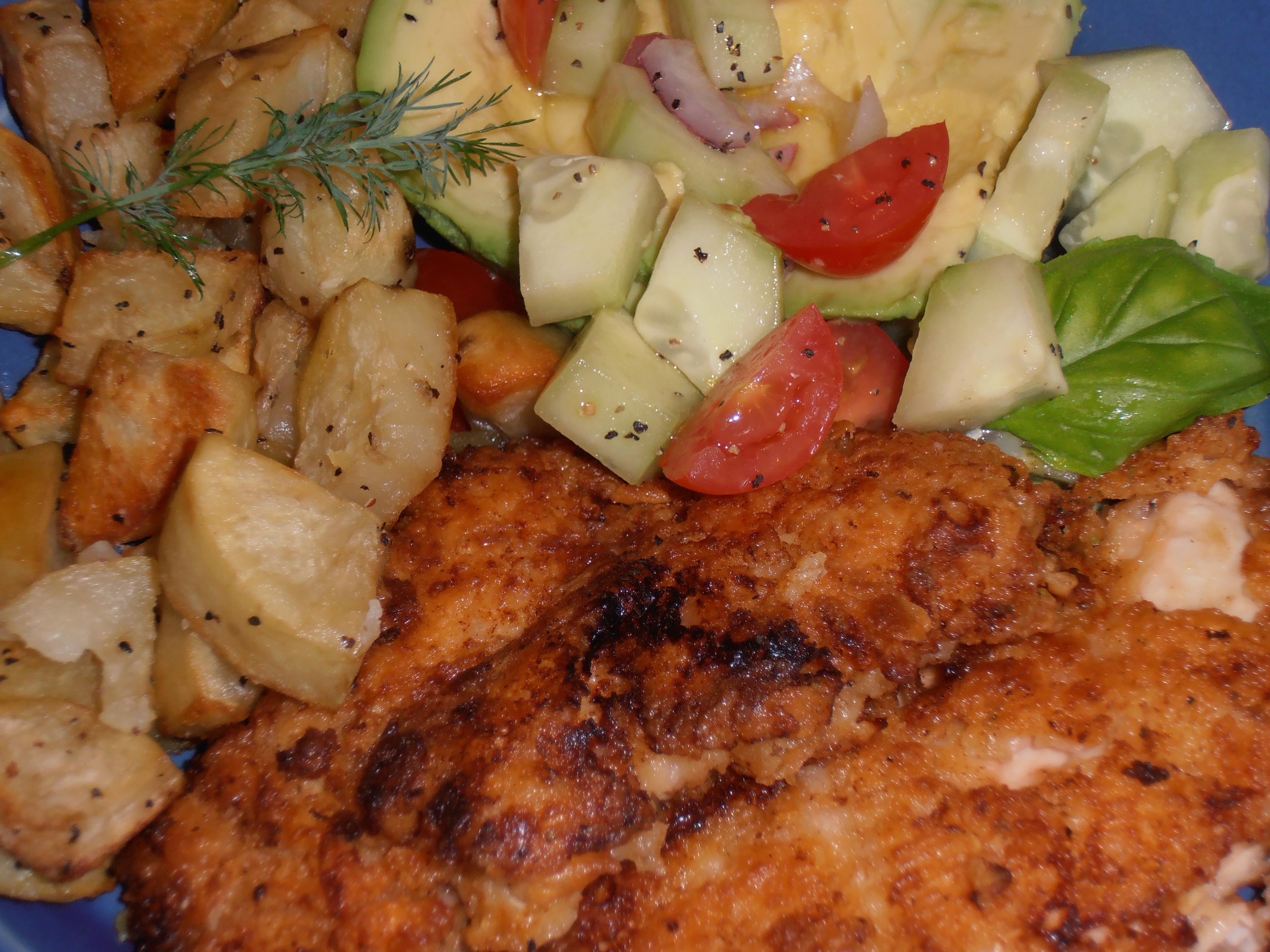 I served it with roasted potatoes and an avocado, red onion, cucumber, tomaoto salad with a vinegarette dressing.