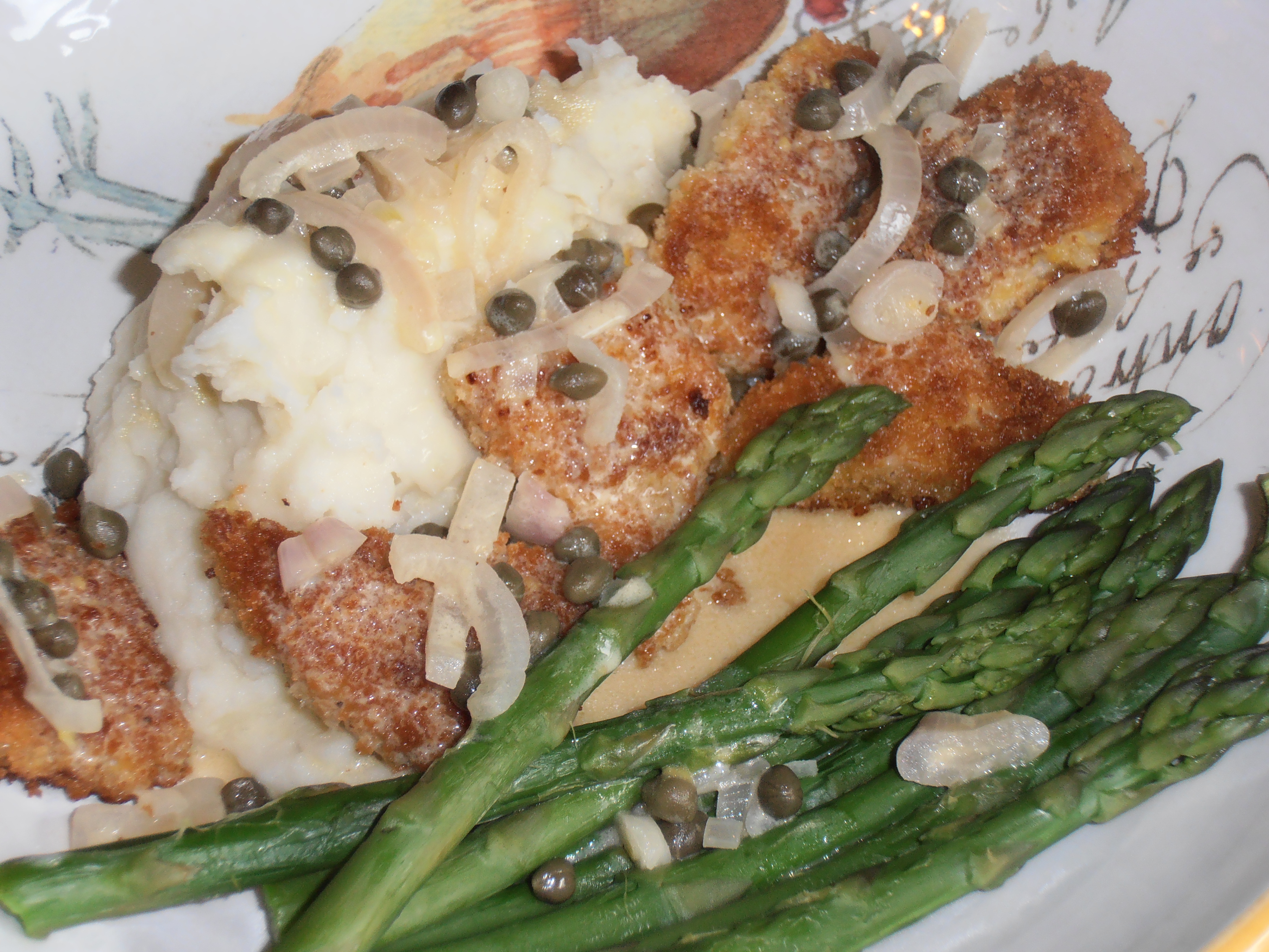 I bought thin cut pork chops, cut the fat off then cut them into medallions. I fried them in extra virgin olive oil after dredging them through flour, eggs (fresh from the chickens!) and Panko. I served them with mashed potatoes and steamed asparagus, and dizzled it all with a mustard-caper sauce I adapted from a 1997 Bon Appetit recipe.