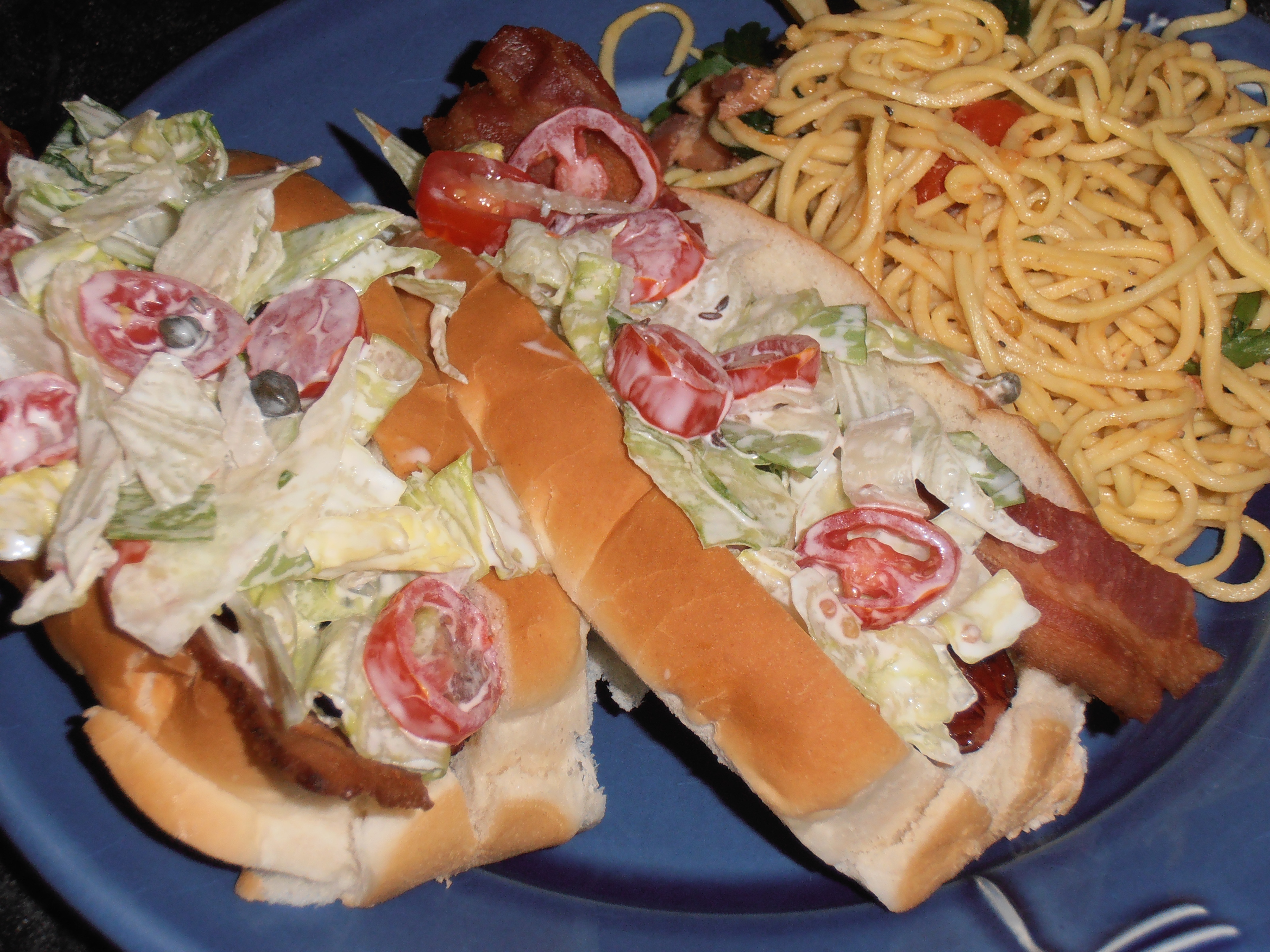 2. Put the cooked hot dogs in the buns; top with the bacon and tomatoes. Toss the lettuce and basil with some of the caraway remoulade. Top the dogs with the slaw. Serve any remaining remoulade on the side.