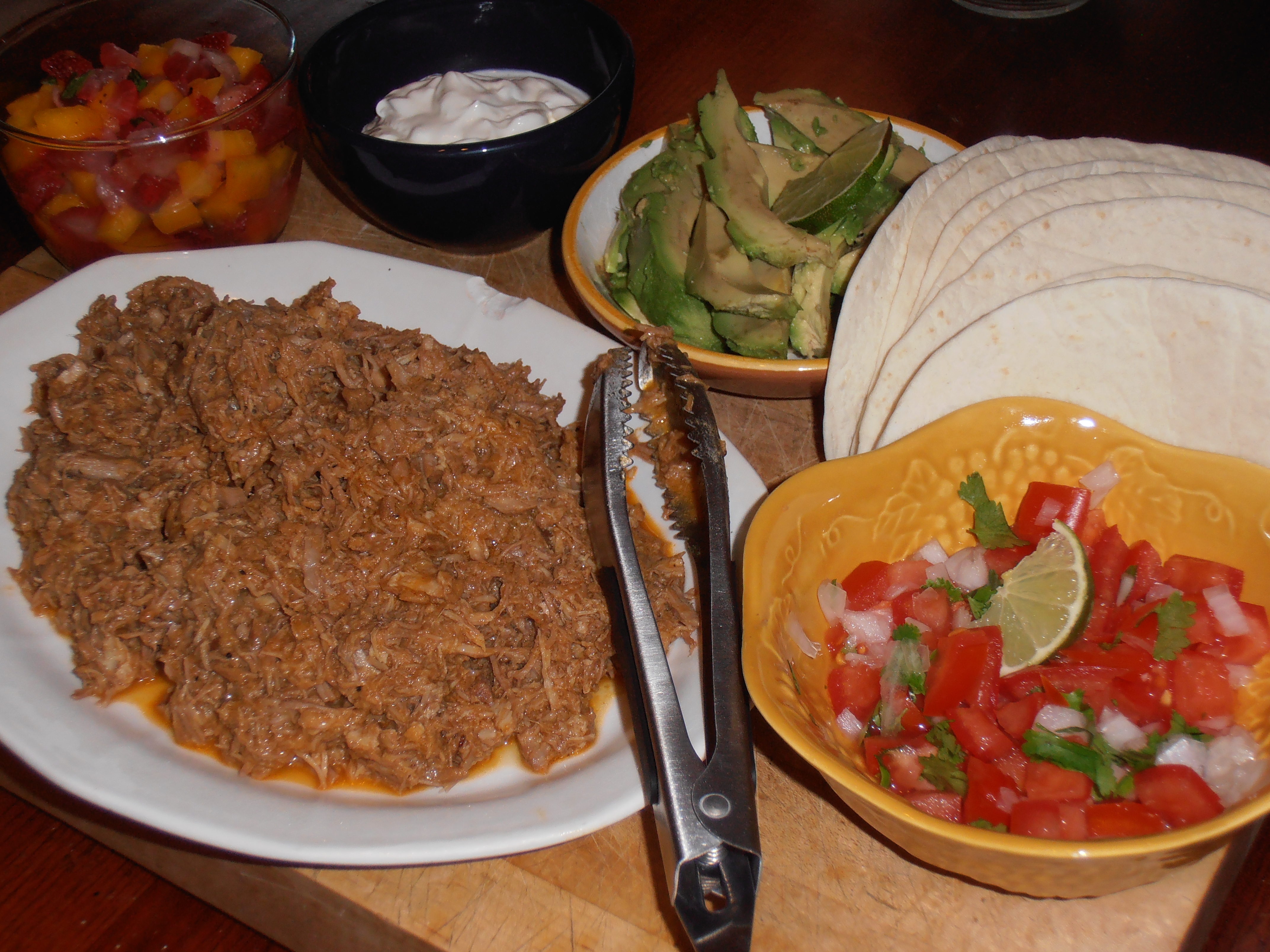 Remove when liquid level is low and meat is falling apart. Shred meat and toss with generous helping of Frank’s Red Hot sauce. Serve with soft tortillas, salsa (fresh tomato, onion, lime and cilantro), sliced avocado and sour cream.