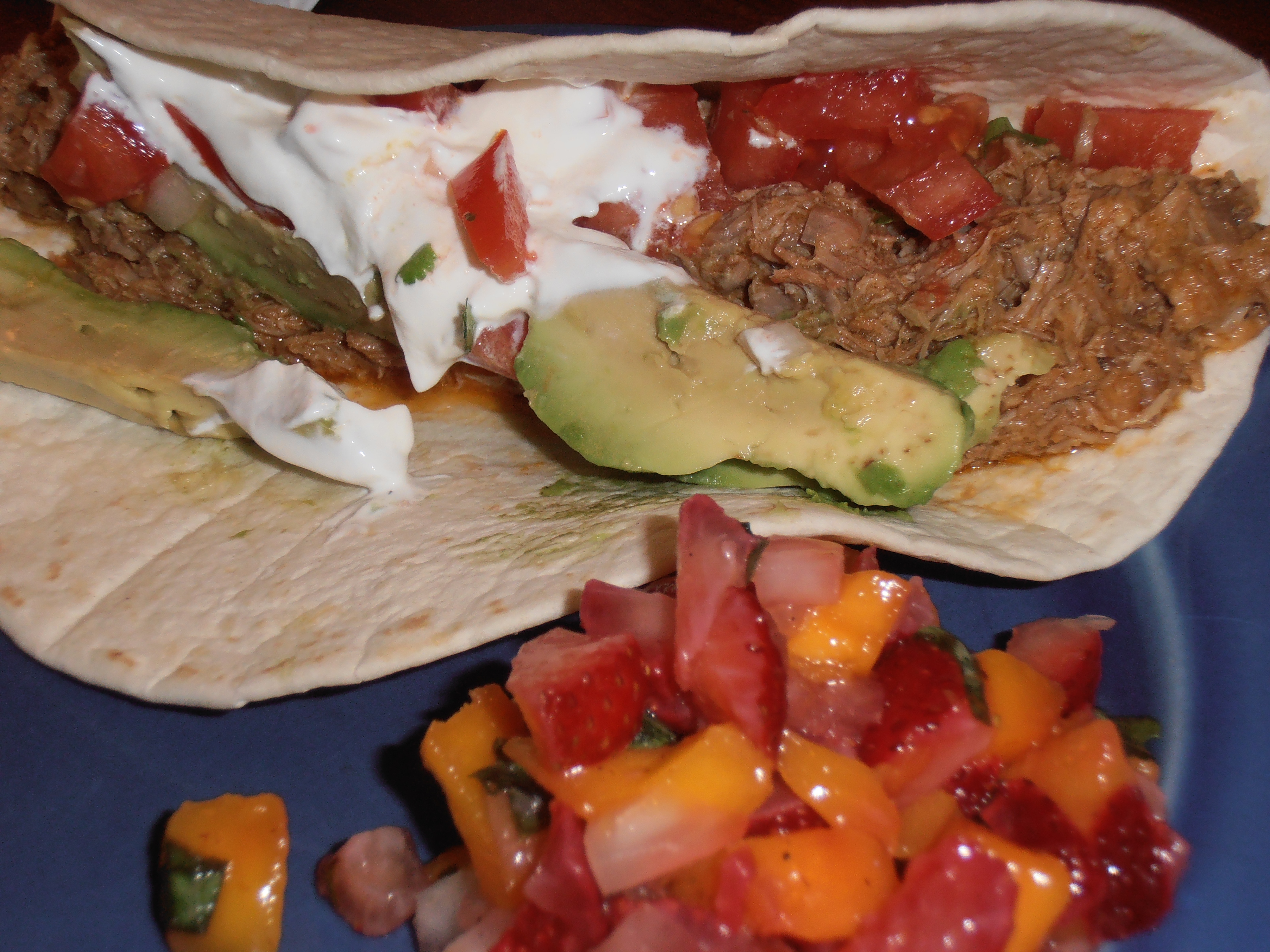 On the post below you’ll see this same photograph. And in the post I told you about the wonderfully refreshing fruit salsa given to me by our friend Debra. This salsa was matched perfectly to our spicy carnitas, but you can also eat it by itself.