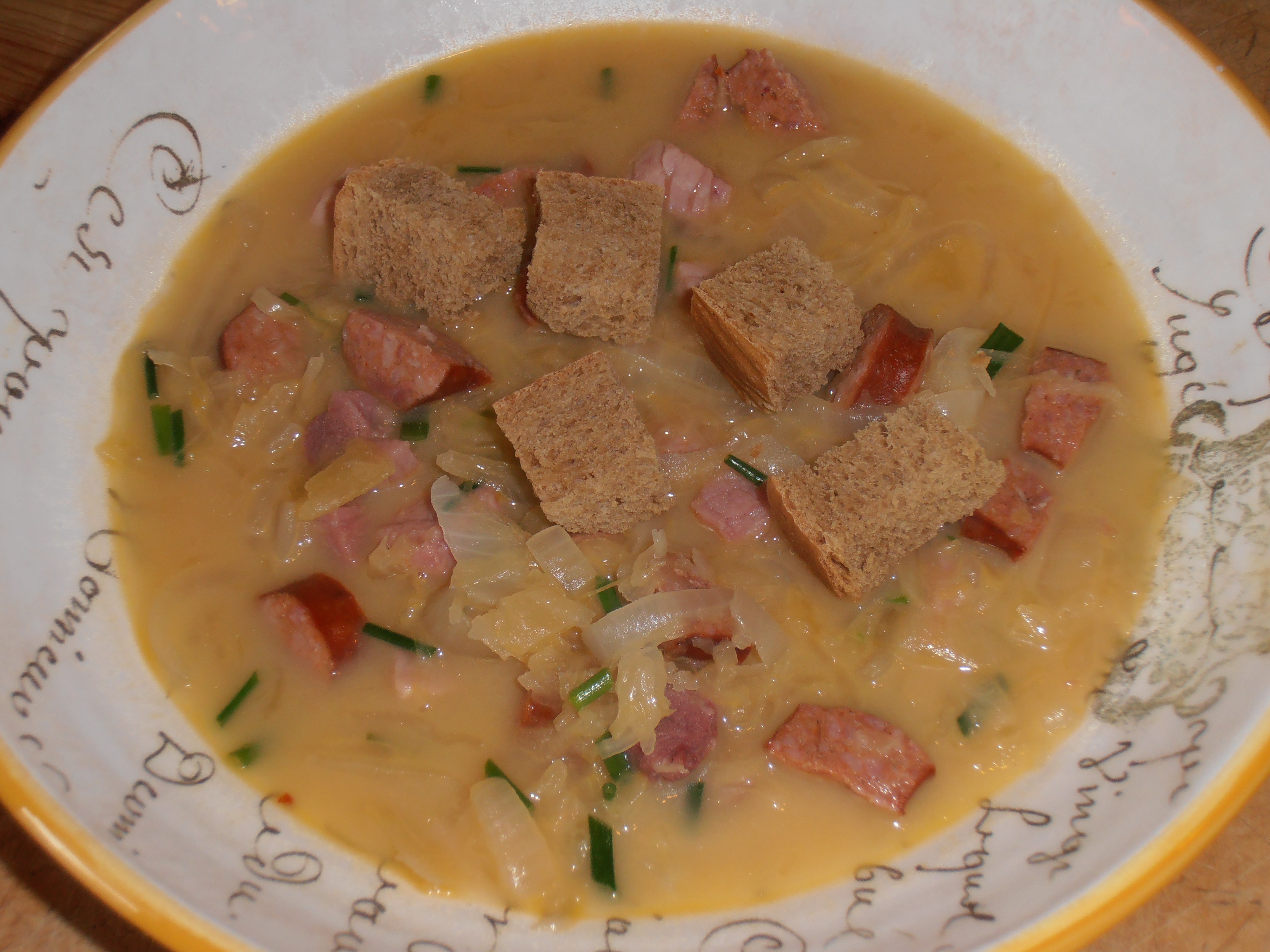 In a large enameled cast-iron casserole, melt the butter. Add the onion, cover and cook over moderate heat, stirring, until softened, about 5 minutes. Add the ham and sausage and cook uncovered, stirring, until lightly browned, about 5 minutes. Stir in the flour. Add the broth and sauerkraut and bring to a boil. Simmer over low heat for 15 minutes. Stir in the crème fraiche and chives. Serve in deep bowls with the rye croutons and horseradish.