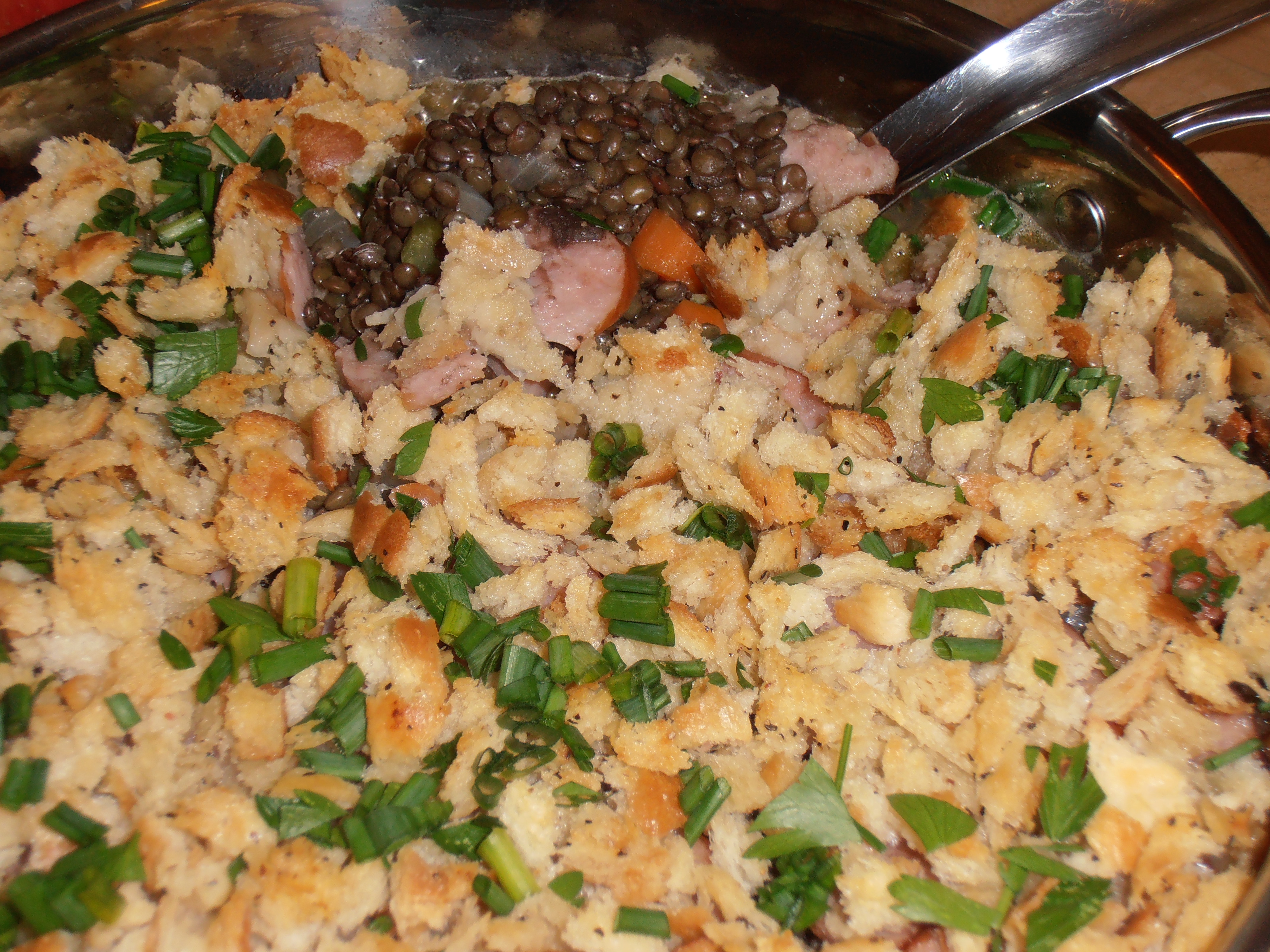 Cut skin from cooled bacon; discard skin. Cut bacon crosswise into 1/3″ thick slices. Add to lentils; toss mixture gently until well combined. Season with salt and pepper. Transfer mixture to a 3-Qt. baking dish.