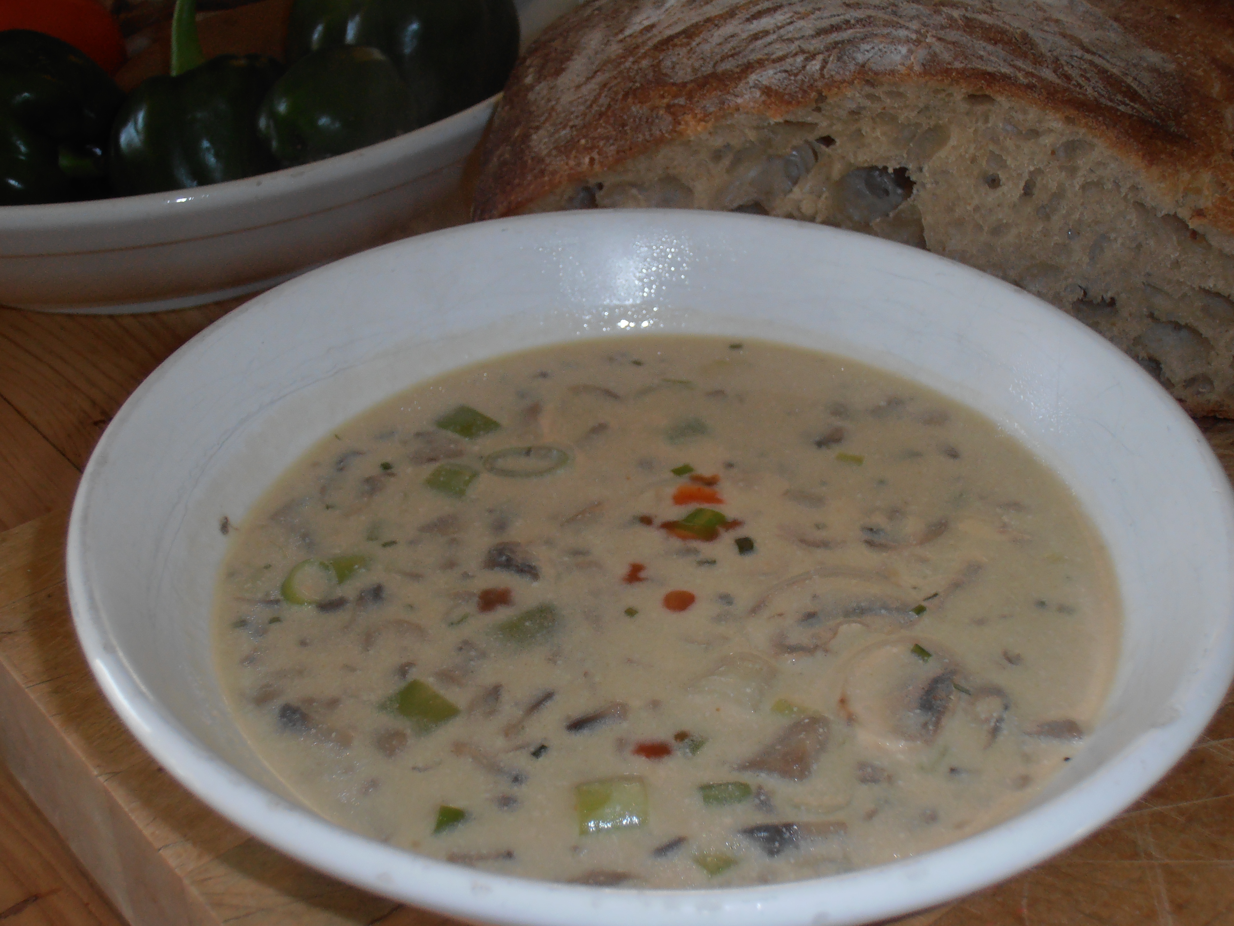 Today’s lunch depended on what was in the fridge. One pound of mushrooms purchased for another dish that I could not find the meat for screamed out to be the main ingredient. I still have scallions in the garden and a wide variety of cookbooks at my disposal. So….this recipe is courtesy of A Feast Of Soups by Jacqueline Heriteau. If you are a vegetarian, just replace the chicken stock with vegetable stock.
