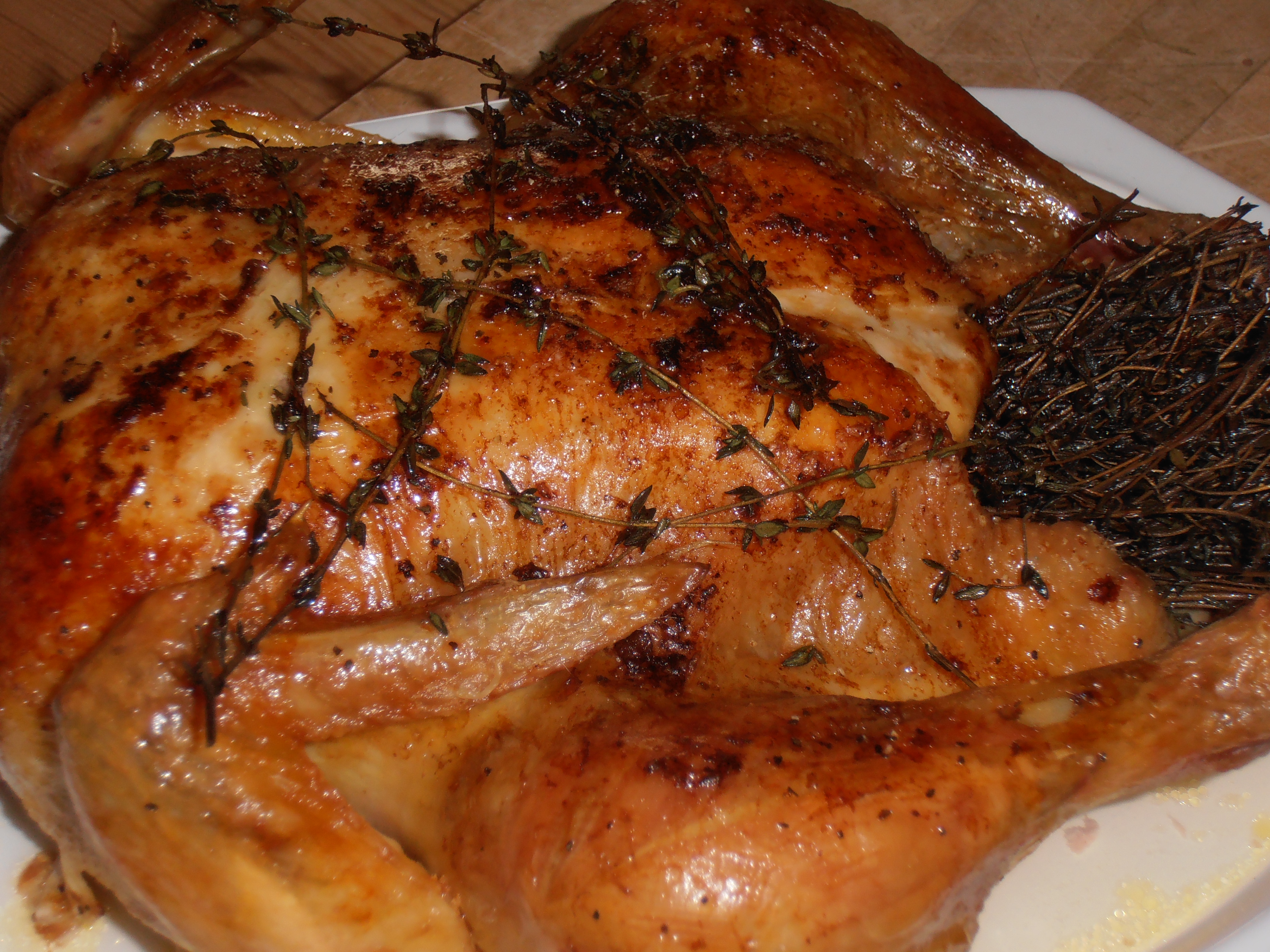 Stuff the chicken with entire bunch of thyme. Smear the chicken with a generous layer of butter. Put the chicken in an oval baking dish, breast side up, and roast for one hour (or until a thermometer reads 180 degrees), regularly spreading the melted butter and juices over the chicken, until nicely browned and crisp on the top. If you like, turn the chicken upside down and roast until the bottom is crispy.