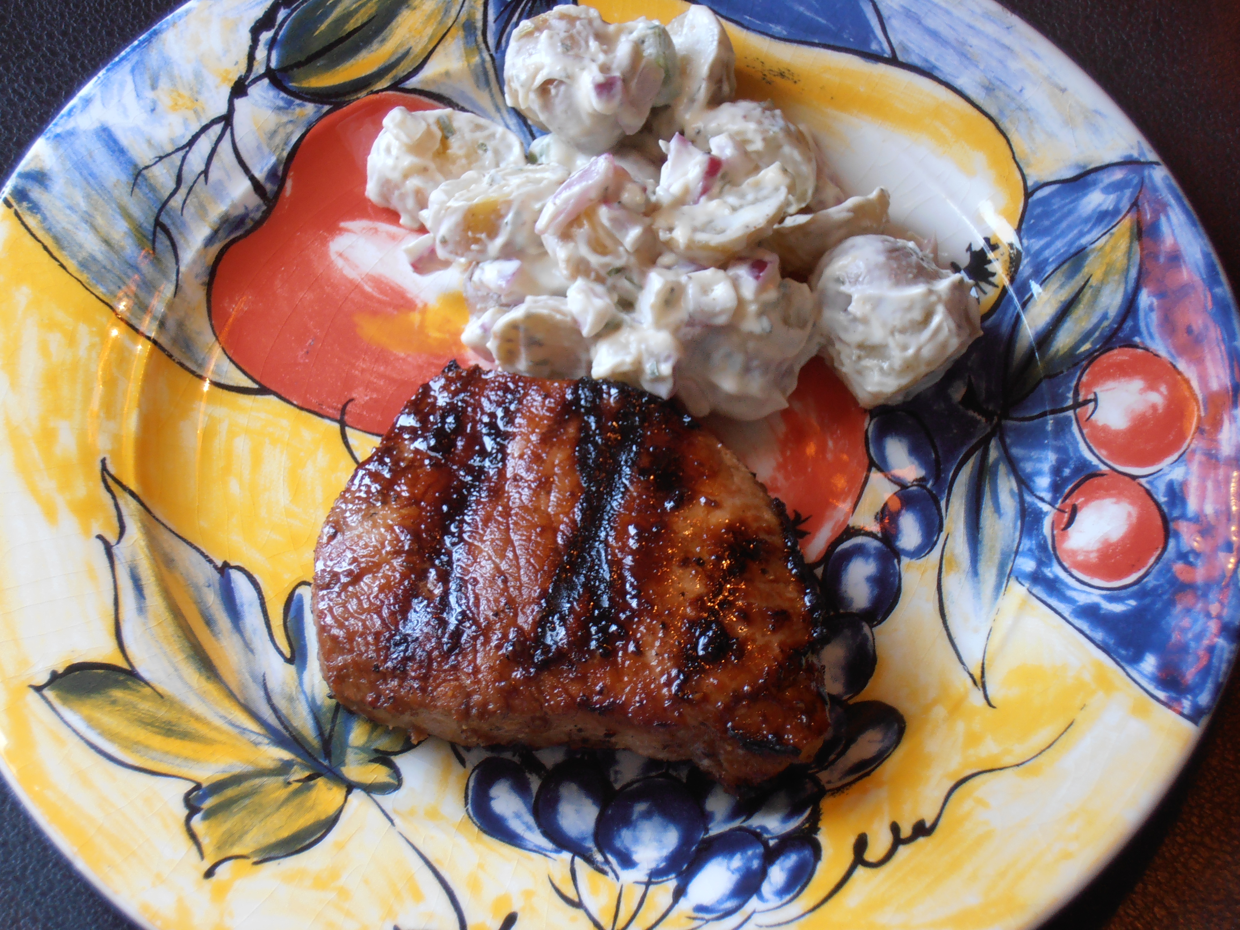 The pork chop recipe comes from The Barbecue Bible by Steven Raichlen and the potato salad recipe comes from 500 Potato Recipes by Elizabeth Woodland. Enjoy!