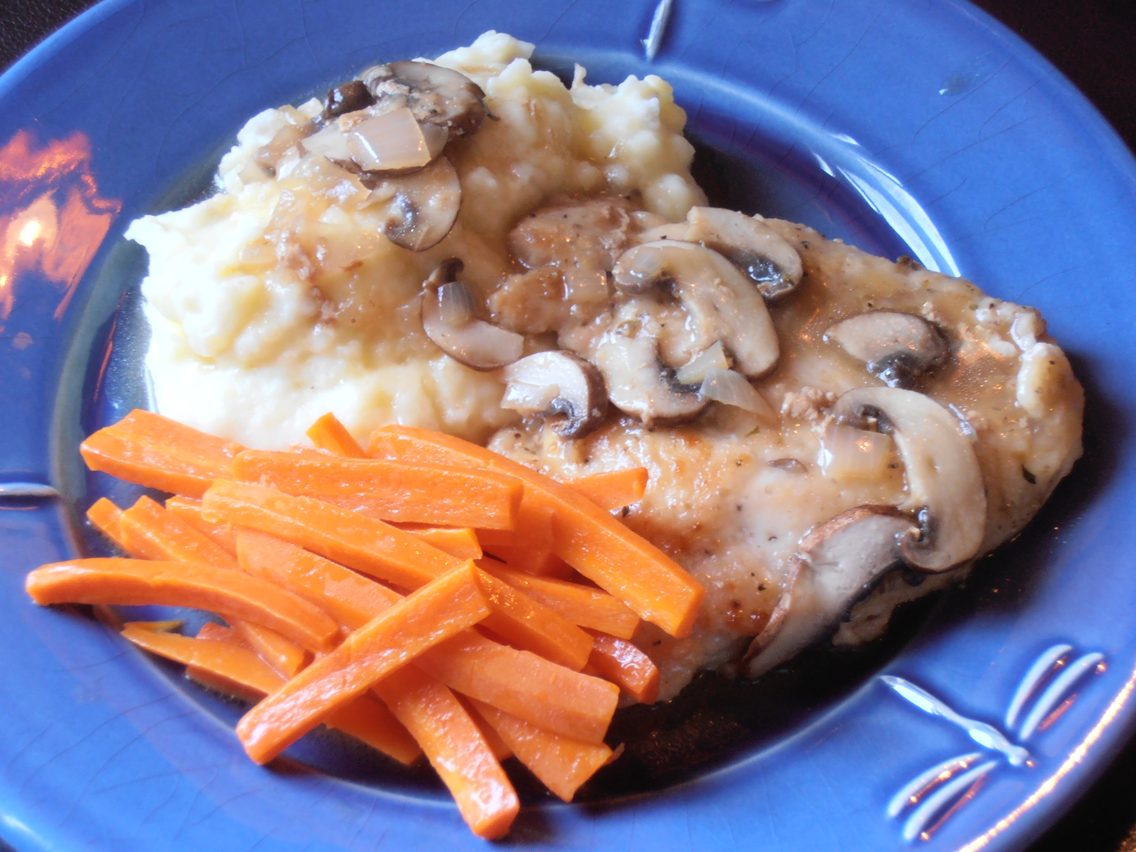 Come hell or high water, regardless of whether I had energy or not, I was making Chicken Marsala for our late lunch…..and that I did. I served it with mashed potatoes, steamed carrots and a small, round, crunchy crusted Tuscan bread. This recipe is very easy and straightforward with amazing results, and if you’d like the sauce creamy, just add about 1/2 cup of heavy cream to the sauce at the very end. (for the sake of a good photograph I limited the amount of sauce on the dish, but after the photo, I added more sauce.)