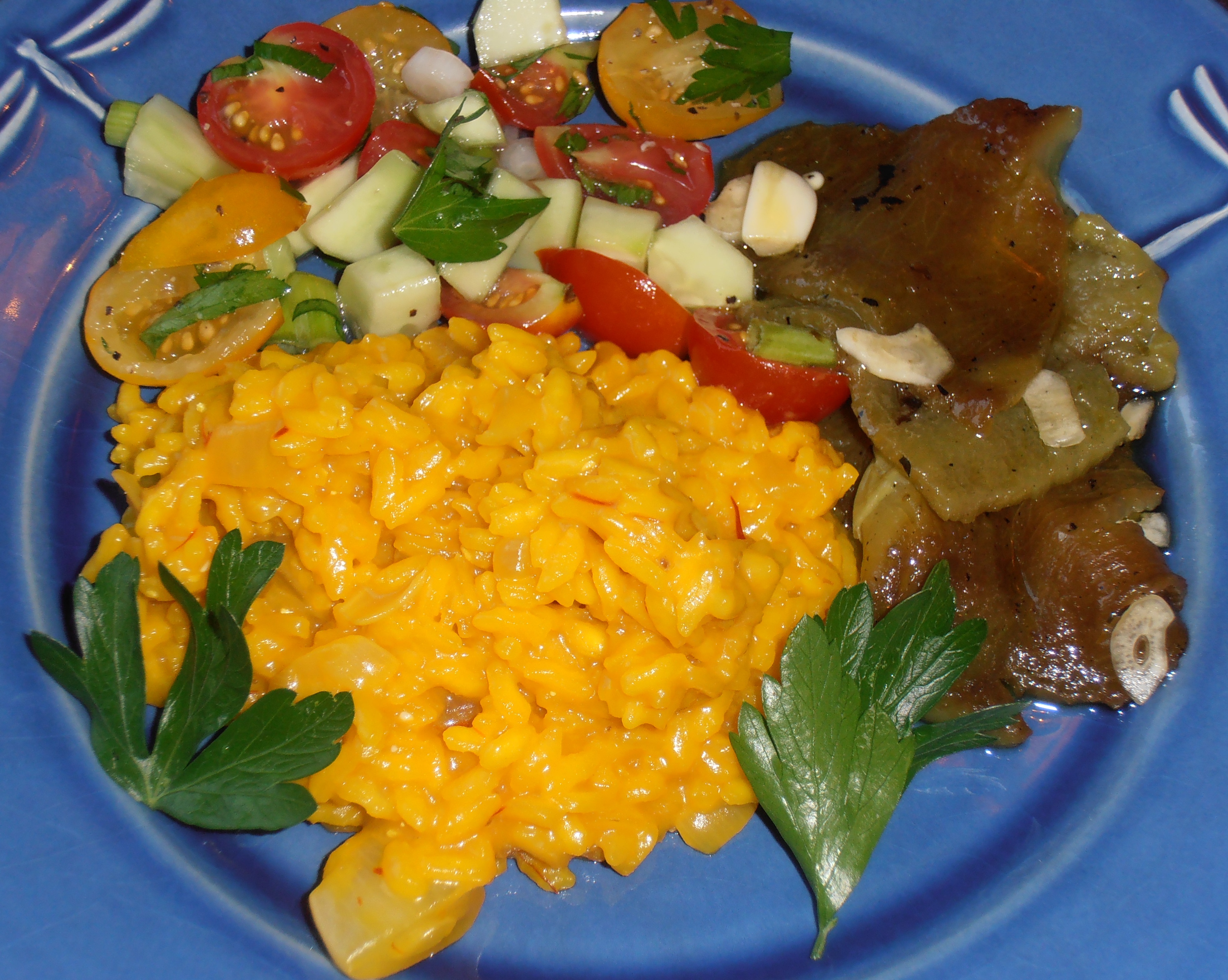 I found this outstanding recipe on the side of my box of Carpi Riso, Riso Arborio. The only thing I did differently is that where it calls for a small onion, I minced a medium onion. I served it with a garden fresh salad of cucumbers, tomatoes and parsley, and also roasted some purple peppers which also came from the garden.