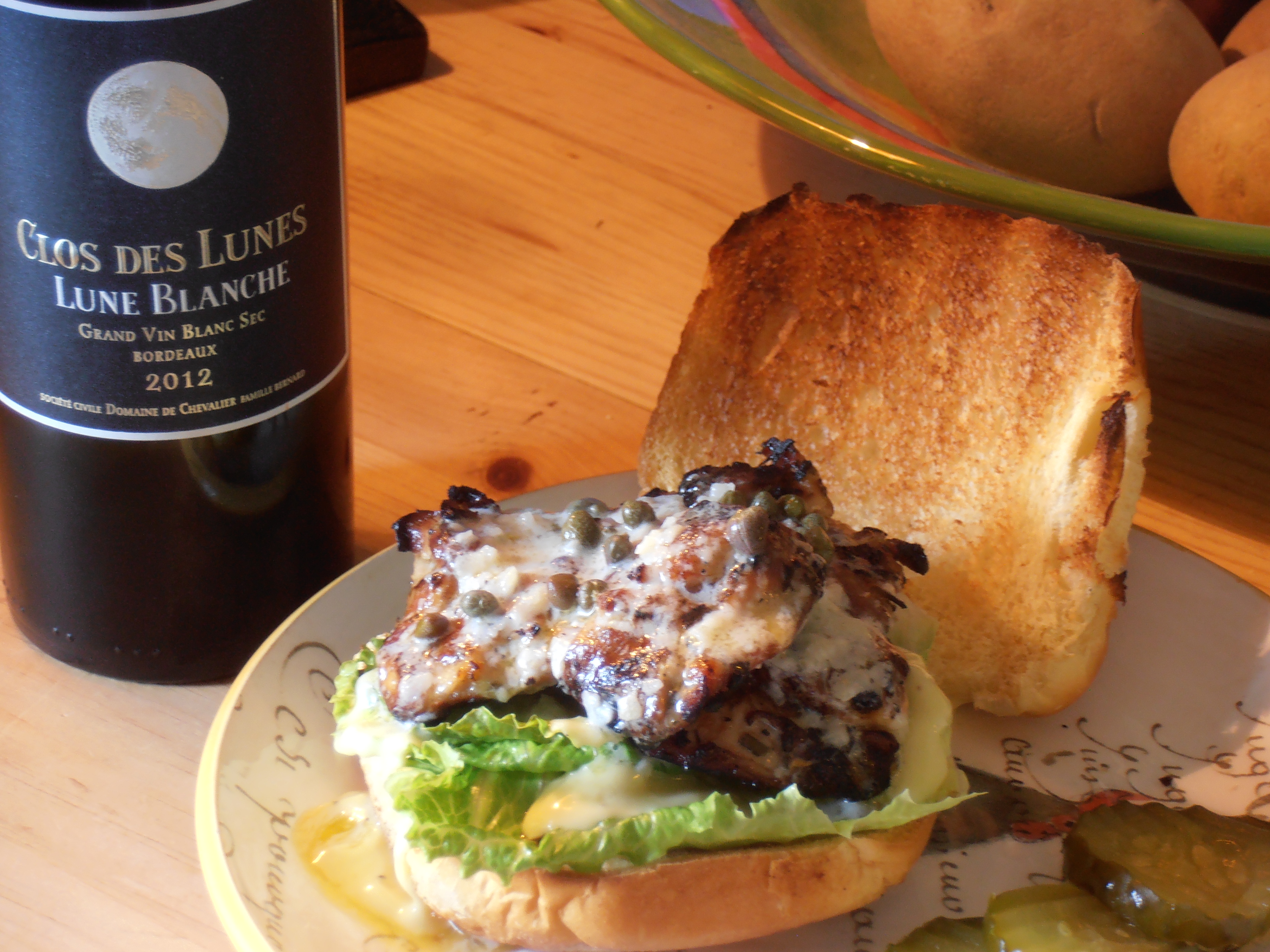 This recipe comes from the June edition of Food and Wine magazine which credits it as coming from Bill or Beak in London. I chose it for our lunch today, knowing ahead of time it was quite a bit of work for a sandwich, but, after tasting this juicy composition, I think it’s well worth the effort. The sandwich is packed with flavor. There is sweetness in the brioche, the romaine lettuce, the chicken and the sauce, and then there are the salty little caper explosions. Now…there were a few things I didn’t do, because I wanted to tone the sandwich down. I did not make the croutons and I didn’t add the anchovies. I sprinkled the capers on the sauce once I drizzled it over the chicken. I did, however, serve it with a glass of 2012, Clos Des Lunes, Grand Vin Blanc Bordeaux. Enjoy!