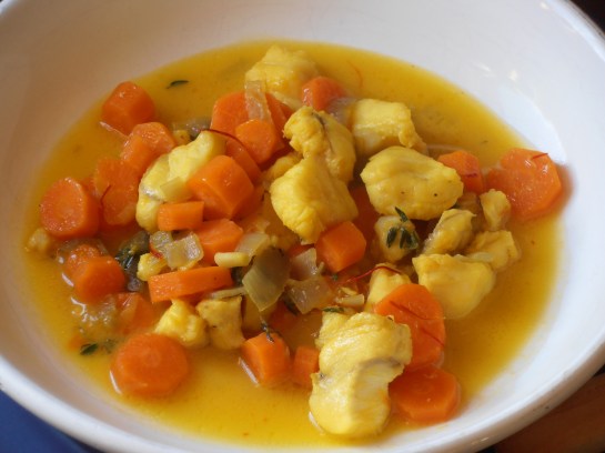 Add the remaining 2 Tbsp. olive oil and the shallots to the casserole and cook over moderate heat, stirring occasionally, until softened, about 2 minutes. Add the carrots and cook, stirring occasionally, until light golden, about 6 minutes. Stir in the thyme, saffron and wine and cook until reduced by half, about 1 minute. Add 1/2 cup water along with the monkfish and any accumulated juices. Add more salt and thyme leaves if needed. Bring just to a simmer, cover and cook over low heat until the vegetables are tender and the fish is cooked through, about 15 minutes.