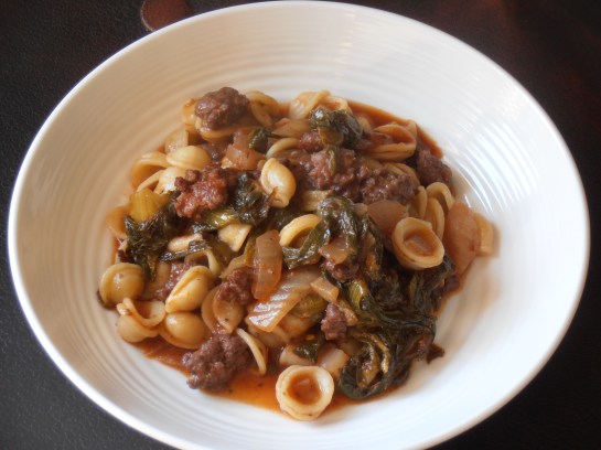 - Meanwhile, in a large saucepan, heat 2 Tbsp. of olive oil. Add the remaining chopped onions and cook over moderate heat, stirring occasionally, until golden and softened, about 10 minutes. Add the chopped escarole in batches, stirring until each batch is wilted before adding more. Add 1 Tbsp. olive oil and the minced garlic and cook, stirring until fragrant, about 2 minutes. Add the white wine and a pinch of crushed red pepper and season with salt. Cook, stirring occasionally, until the escarole is tender, about 40 minutes. Stir the escarole mixture into the sausage ragu.