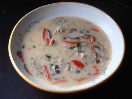 - Stir in rice, coconut milk and bell pepper into soup. Cover and cook 15 minutes. Turn off heat. Stir in cilantro and lime peel before serving.