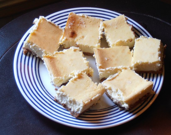 From Giada’s Family Dinners book, and I quote: “Refreshing, light, and decadent, these squares are a cross between mini cheesecakes and everyone’s favorite lemon bars.