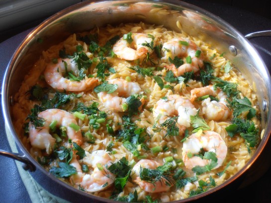 - Cover and reduce heat to low. Cook, undisturbed, until orzo is tender, about 12 minutes, adding shrimp during the final 3 minutes of cook time. Remove pan from heat. Sprinkle evenly with scallion tops, parsley and dill.