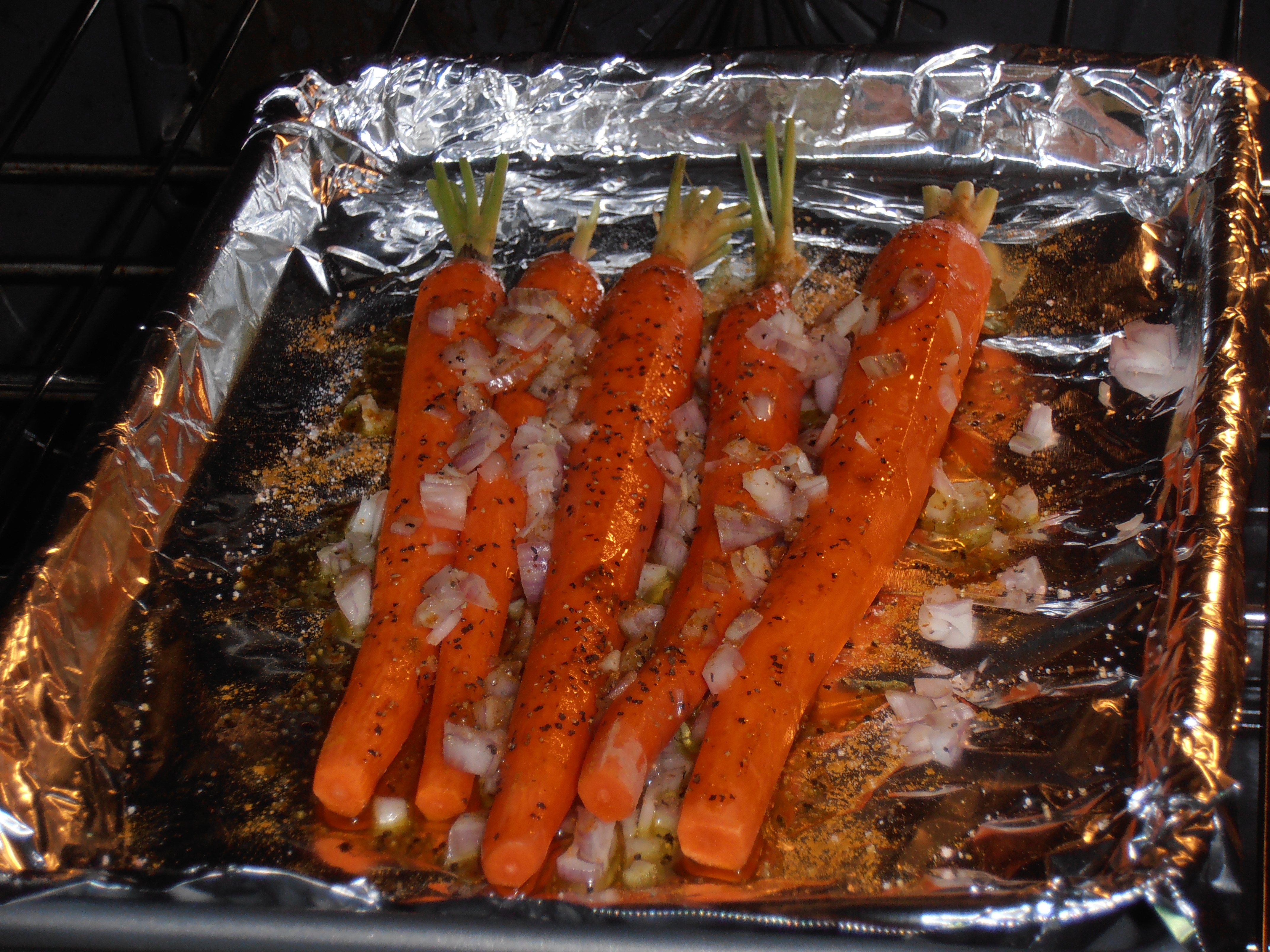 Heat your oven to 425, peel then dress your carrots with extra virgin olive oil, diced shallots, curry powder, salt and pepper and put them in the oven for at least 20 minutes.